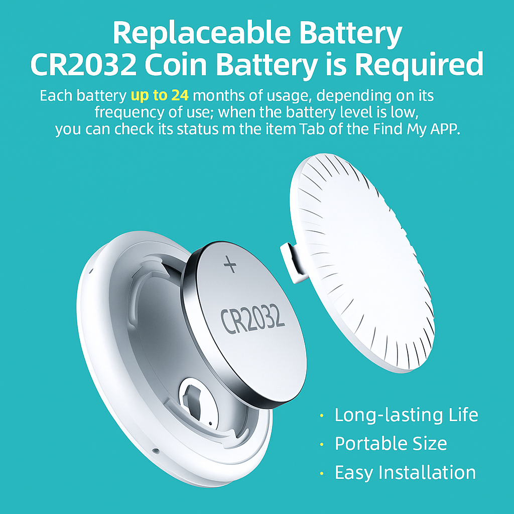 iFind Mini GPS uses a standard CR2032 coin battery, which is easy to replace and lasts up to 24 months. Compact and convenient – track your items without daily charging.