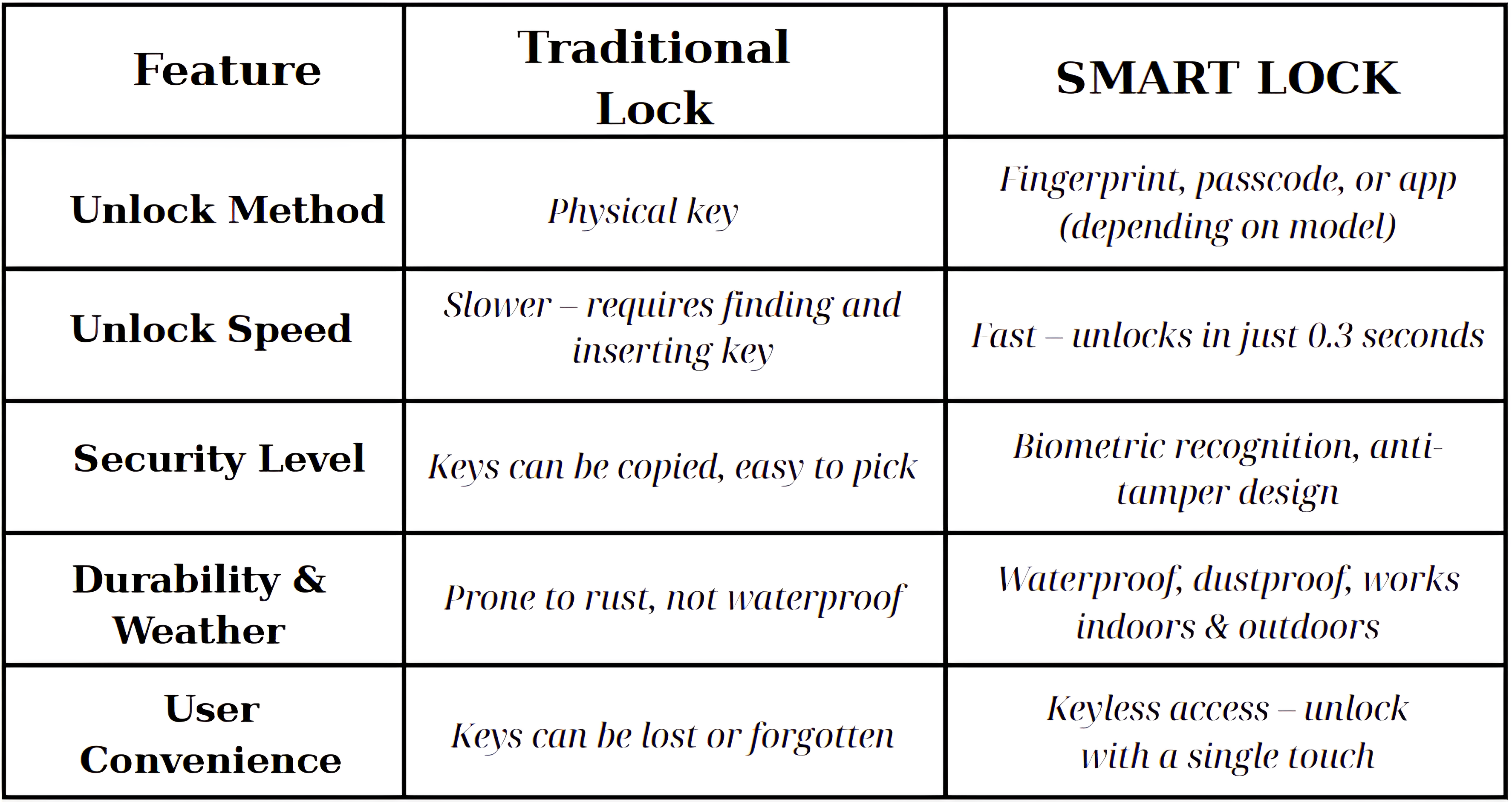 SMART LOCK is crafted from high-quality, rust-resistant, and impact-resistant materials, ensuring reliable performance in all weather conditions. With its waterproof, dustproof, and tamper-resistant design, the lock maintains top functionality even after thousands of uses. It’s the perfect fingerprint lock solution for both indoor and outdoor environments.